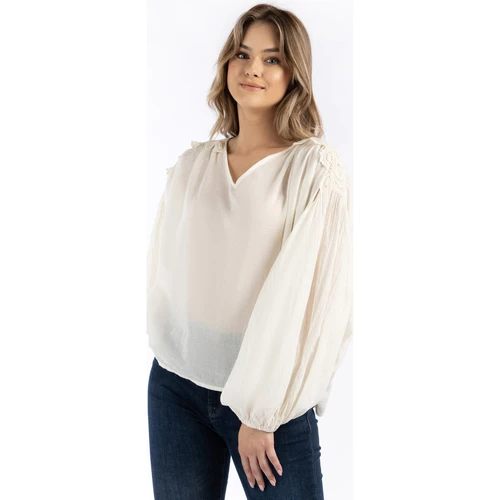 Die luftig-leichte Baumwolle und der legere Schnitt machen die in Italien gefertigte Langarmbluse von DreiMaster Vintage zum Everyday-Darling. Die weiten Ballonärmel zeigen Plisseefalten an den Schultern und enden in elastischen Ärmelabschlüssen, der weite V-Ausschnitt schmeichelt dem Dekolleté. Besonders hervorzuheben ist die grobe Baumwollspitze, die die Schultern akzentuiert.