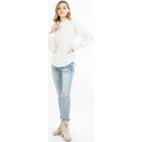 About You Material: Doublure : pas de doublure; matériel de dessus : 100% cotonArtikelnummer: 37324859Ausschnitt: col hautBlusen-Stil: blouse classiqueBreite: 47cmDetails: à volantsFarbe (Produkt): WollweissFutter: sans doublureGesamtlänge/Rückenlänge Größe S: 6,0cmGrößenflag: taille normalKragen: Col à volantsLagen: non spécifiéLänge: moyenMaterial: 100% cotonMaterial Oberstoff: 100% cotonMaterial-Eigenschaft: CotonMuster: uniOberteillänge: normalPassform: normalPflegehinweise: Cycle doux de lavage à 30°, ne pas blanchir, ne pas sécher en machine, ne pas repasser, ne pas nettoyer, ne pas utiliser d’adoucissant, ne pas tremperProdukttyp: Blouse à manches longuesSaison: HW22Saum: ourlet droitSondergröße: non spécifiéStil Strick: ChemisiersTaschen: aucun / sans objetTechnologie Jeans: non spécifiéVerschluss: Panneau à boutonsZielgruppe: femmesÄrmelart: manche longueÄrmellänge: manche longueFarbe: blanc casséBaumwollbluse mit RüscheGerüschter StehkragenRüsche an der KnopfleisteCoton purGelegte Falten an der ManschetteCoupe régulière