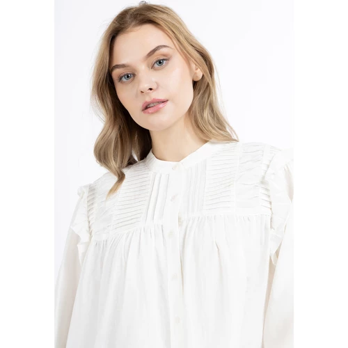 About You Material: Doublure : pas de doublure; matériel de dessus : 100% cotonArtikelnummer: 37324860Ausschnitt: col hautBlusen-Stil: blouse classiqueBreite: 47cmDetails: à volantsFarbe (Produkt): WollweissFutter: sans doublureGesamtlänge/Rückenlänge Größe S: 6,0cmGrößenflag: taille normalKragen: Petit col montantLagen: non spécifiéLänge: moyenMaterial: 100% cotonMaterial Oberstoff: 100% cotonMaterial-Eigenschaft: CotonMuster: uniOberteillänge: normalPassform: décontractéPflegehinweise: Cycle doux de lavage à 30°, ne pas blanchir, ne pas sécher en machine, ne pas repasser, ne pas nettoyer, ne pas utiliser d’adoucissant, ne pas tremperProdukttyp: Blouse à manches longuesSaison: HW22Saum: ourlet profiléSondergröße: non spécifiéStil Strick: ChemisiersTaschen: aucun / sans objetTechnologie Jeans: non spécifiéVerschluss: Panneau à boutonsZielgruppe: femmesÄrmelart: manche longueÄrmellänge: manche longueFarbe: blanc casséLockere BaumwollblusePlissierter StehkragenRüsche an der SchulterCoton purPanneau de boutons sur toute la longueurPoignets élastiques