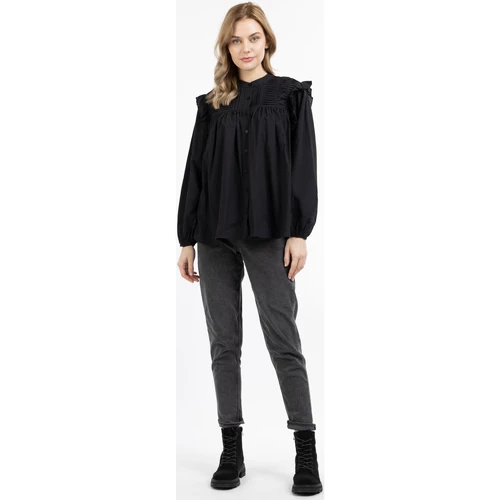 About You Material: Doublure : pas de doublure; matériel de dessus : 100% cotonArtikelnummer: 37324860Ausschnitt: col hautBlusen-Stil: blouse classiqueBreite: 47cmDetails: à volantsFarbe (Produkt): SchwarzFutter: sans doublureGesamtlänge/Rückenlänge Größe S: 6,0cmGrößenflag: taille normalKragen: Petit col montantLagen: non spécifiéLänge: moyenMaterial: 100% cotonMaterial Oberstoff: 100% cotonMaterial-Eigenschaft: CotonMuster: uniOberteillänge: normalPassform: décontractéPflegehinweise: Cycle doux de lavage à 30°, ne pas blanchir, ne pas sécher en machine, ne pas repasser, ne pas nettoyer, ne pas utiliser d’adoucissant, ne pas tremperProdukttyp: Blouse à manches longuesSaison: HW22Saum: ourlet profiléSondergröße: non spécifiéStil Strick: ChemisiersTaschen: aucun / sans objetTechnologie Jeans: non spécifiéVerschluss: Panneau à boutonsZielgruppe: femmesÄrmelart: manche longueÄrmellänge: manche longueFarbe: noireLockere BaumwollblusePlissierter StehkragenRüsche an der SchulterCoton purPanneau de boutons sur toute la longueurPoignets élastiques