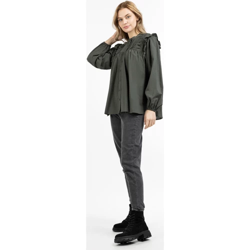 About You Material: Doublure : pas de doublure; matériel de dessus : 100% cotonArtikelnummer: 37324860Ausschnitt: col hautBlusen-Stil: blouse classiqueBreite: 47cmDetails: à volantsFarbe (Produkt): DunkelolivFutter: sans doublureGesamtlänge/Rückenlänge Größe S: 6,0cmGrößenflag: taille normalKragen: Petit col montantLagen: non spécifiéLänge: moyenMaterial: 100% cotonMaterial Oberstoff: 100% cotonMaterial-Eigenschaft: CotonMuster: uniOberteillänge: normalPassform: décontractéPflegehinweise: Cycle doux de lavage à 30°, ne pas blanchir, ne pas sécher en machine, ne pas repasser, ne pas nettoyer, ne pas utiliser d’adoucissant, ne pas tremperProdukttyp: Blouse à manches longuesSaison: HW22Saum: ourlet profiléSondergröße: non spécifiéStil Strick: ChemisiersTaschen: aucun / sans objetTechnologie Jeans: non spécifiéVerschluss: Panneau à boutonsZielgruppe: femmesÄrmelart: manche longueÄrmellänge: manche longueFarbe: Olive noireLockere BaumwollblusePlissierter StehkragenRüsche an der SchulterCoton purPanneau de boutons sur toute la longueurPoignets élastiques