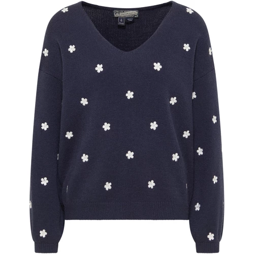 Mit seinen aufgestickten Blümchen wird der Basic V-Ausschnitt-Pullover von DreiMaster Vintage zu etwas ganz Besonderem. Die klare Linie ist aus einem weichen Garngemisch gefertigt und zeigt eine legere Silhouette. Abgeschlossen wird das verspielte Design durch elastische Rippstrickbündchen.