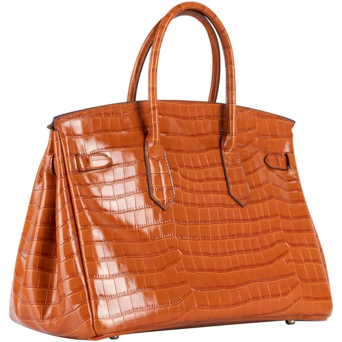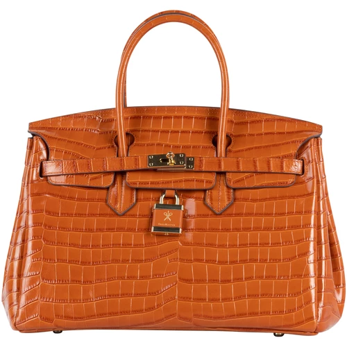 Runden Sie Ihre Garderobe mit der edlen Henkeltasche von DreiMaster Klassik ab. Die aus Leder gefertigte Tasche, begeistert mit ihrer eleganten Krokodillederoptik und den zwei kurzen Henkeln. Goldglänzende Metalldetails sowie ein Schloss mit Brandverzierung verleihen dem strukturierten Design ein gelungenes Finish. Der geräumige Innenraum hat ein Baumwollfutter mit einer Reißverschlusstasche und zwei Stecktaschen. Maße: 35cmx 27cm x 18cm (BxHxT)