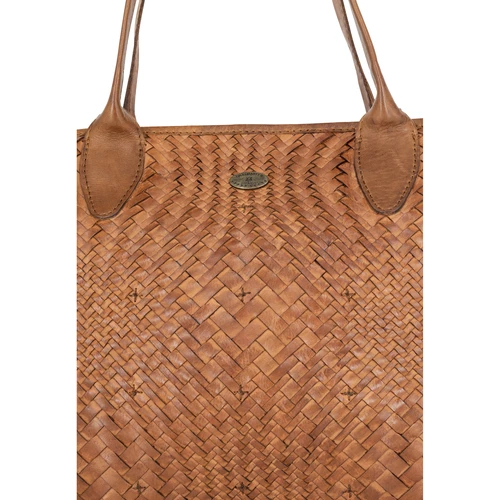Das sehr weiche Rindsleder dieser DreiMaster Vintage Handtasche wurde auf der Vorderseite aufwendig geflochten, wodurch ein ganz individueller Look entsteht. Dank diverser Lederwaschungen zeigt sie einen lässigen Vintage-Charakter, der mit einigen Unregelmäßigkeiten im Leder der Tasche eine ganz einzigartige Note verleiht. Das softe Innenfutter ist aus Baumwolle gefertigt und bietet neben Steckfächern und einer Reißverschlusstasche viel Platz für alle wichtigen Essentials. Mit dem kleinen Henkel kann sie ganz nonchalant in der Hand getragen werden. Ein graviertes Logo-Patch aus Metall schmückt die Frontseite. Maße: 46cm x 29,5cm x 4cm (BxHxT)
