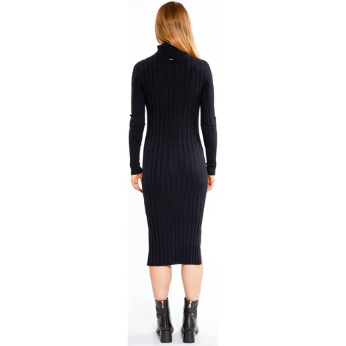 Das schmale Rippstrickkleid von DreiMaster Klassik punktet in jeder Hinsicht. Die weiche Viskose-Modal-Mischung liegt weich auf der Haut, während der hohe Rollkragen entspannt den Hals warm hält. Abgerundet wird das klassisch-elegante Modell mit langen Ärmelbündchen, die mit gravierten Druckknöpfen verziert sind. Der Pullover ist figurbetonend und hat jeweils an den Seiten einen Schlitz.