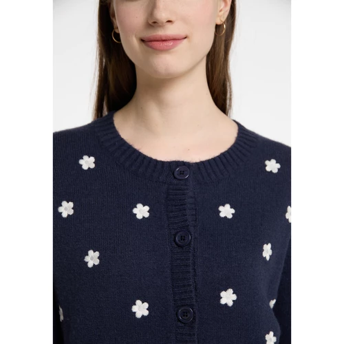 Mit seiner zauberhaften Blumenstickerei, setzt sich der Cardigan von DreiMaster Vintage ausdrucksvoll in Szene. Gefertigt aus einem weichen Garngemisch finalisieren die Rippstrickbündchen und die durchgehende Knopfleiste das verspielte Design.