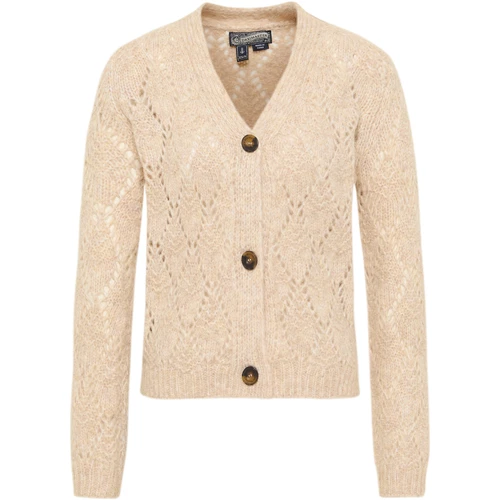 Dieser Cardigan von DreiMaster Vintage ist aus einem weichen Garngemisch gefertigt und mit einem durchbrochenen Lochmuster versehen, das ein rauteförmiges Muster erzeugt. Die eher schmale, kurze Form hat einen V-Ausschnitt und drei große Knöpfe. Formstabile Rippstrickbündchen finalisieren das Modell.